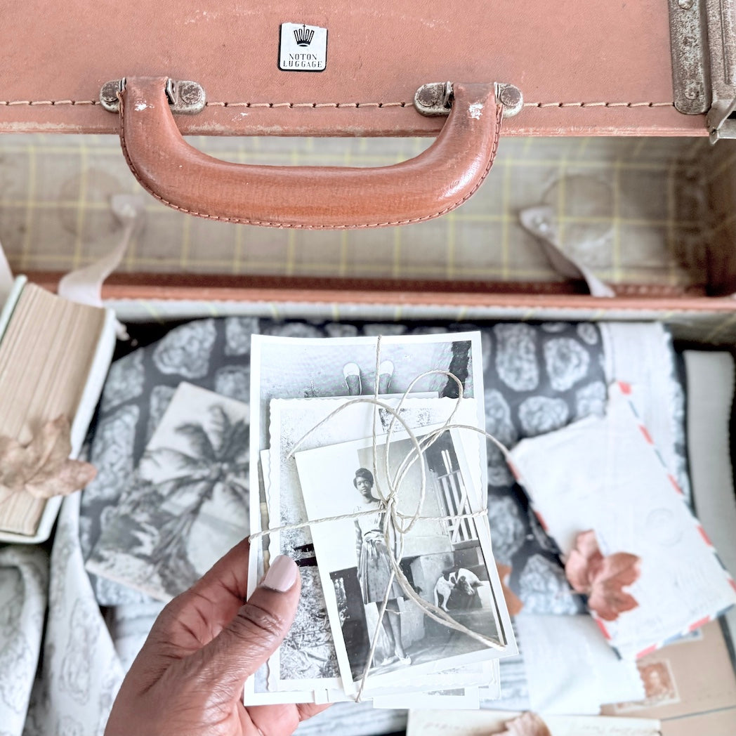 Over the years, that suitcase has grown into a quiet archive, filled not only with family history but also with vintage finds and poetic fragments of a creative life.